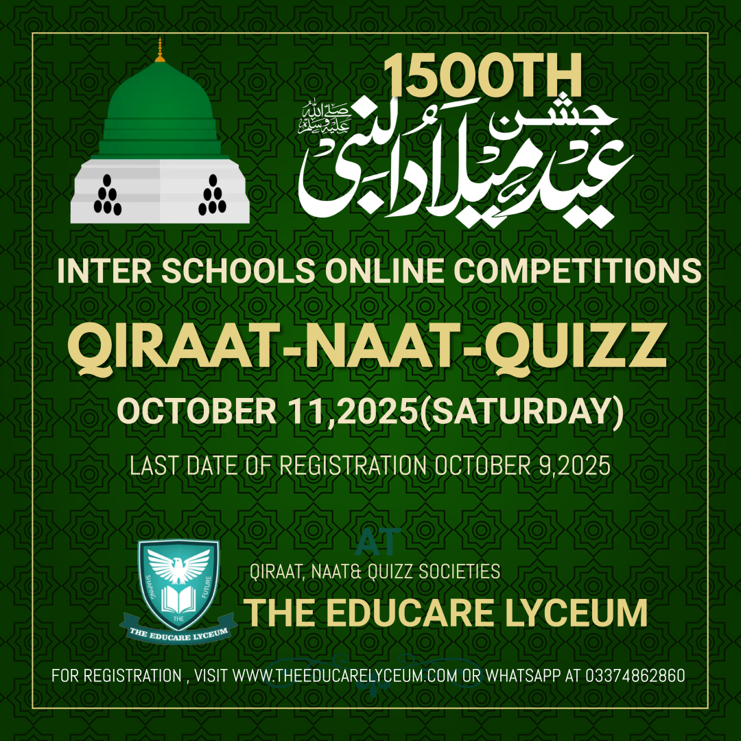 The Educare Lyceum is goin to celebrate 1500th Milad Unnabi (PBUH) by holding Qirrat, Naat and Quizz competitions to inject the love of Holy Prophet(SAW) in our students .